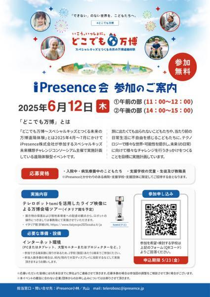 iPresenceiPresence Magazineアバターロボット【6/12開催】「どこでも万博 ~スペシャルキッズとつくる未来の万博遠隔体験」参加校・団体を募集します! アバターロボット 2025.05.30 2025.04.23 【6/12開催】「どこでも万博 ~スペシャルキッズとつくる未来の万博遠隔体験」参加校・団体を募集します! 「どこでも万博」は、移動が困難な子どもたちが、共にテレロボットtemiに乗り込み、リアルタイム映像を通じてあたかも現地を訪れているかのように万博会場を遠隔体験できるプログラムです。現在、2025年6月12日に実施予定のイタリア館ツアーへの参加校・施設を募集しております。 iPresence株式会社は、スペシャルキッズ未来構想チャレンジコンソーシアム主催の遠隔体験イベント「どこでも万博 ~スペシャルキッズとつくる未来の万博遠隔体験~」に参加いたします。 「どこでも万博~スペシャルキッズとつくる未来の万博遠隔体験」とは2025年4月~7月にかけて、iPresence株式会社が参加するスペシャルキッズ未来構想チャレンジコンソーシアム主催で実施計画している遠隔体験型イベントです。旅に出たくても出られないこどもたちや、当たり前の日常生活に不自由を感じるこどもたちに、テクノロジーで様々な世界・可能性を提示し、未来(の日常)に向けて様々なチャレンジを行うきっかけをつくることを目標に実施計画しています。 今回は、2025年6月12日(木) に実施予定の「iPresence会」に参加いただける学校・団体を募集しています。入院中や病気療養中のこどもたち、支援学校の児童が会場内に配置した、自動移動型テレプレゼンスアバターロボット「temi」を活用し、自分の場所にいながら未来の万博を体感できる機会を提供いたします。 応募資格・入院中/病気療養中のこどもたち ・支援学校の児童/生徒及び教職員 ※iPresenceとかかわりのある病院/支援学校/支援団体に限定してご招待する会となります。 実施内容 テレロボットtemiを活用したライブ映像による万博会場ツアー(イタリア館を予定)詳細URL https://www.italyexpo2025osaka.it/ja 画像クリックでPDF表示日時:2025/6/12(木)① 午前の部 11:00~12:00② 午後の部 14:00~15:00 内容:会場内を自動で移動するロボット「temi(テミ)」が撮影するリアルタイムの映像を通して、まるでその場にいるかのような臨場感あふれる「イタリア館」の遠隔ツアーを体験していただきます。 インターネット環境:(PCまたはタブレット、大型モニターまたはプロジェクターなど。)※参加できる端末数に限りがあるため、1学校(施設)あたり1端末でご参加ください。※参加人数多数の場合は、校内/院内で大型ディスプレイに投影するなどして実施頂きますようお願いします。 申込期限: 2025/5/23(金) 注意事項:※応募いただいた皆様には5月末日までに弊社よりご連絡させて頂きます。応募多数の場合は参加回の調整をご相談させて頂く場合がございます。※本イベントの趣旨に合わない企業/団体からのお申し込みについてはお断りさせて頂きます。※展示物の保護および現地来場者への配慮の観点から、ロボットの操作につきましては事務局にて実施させていただきます。 iPresence会 イベント申込フォーム 申込受付終了いたしました あわせて読みたい テレロボット「temi」でつなぐ未来の万博体験 — リアルとバーチャルが融合する瞬間この記事では、2025年大阪・関西万博で活躍する案内ロボット「temi」を活用した案内や遠隔接客、さらに「どこでも万博」プロジェクトについて紹介します。 前の記事へ 一覧へ戻る 次の記事へ 最新記事 【2025年11月】フィジカル会話AIブラウザ版の提供開始&万博総括 【大阪・関西万博 閉幕記念】未来のコミュニケーションをテレポート! iPresenceが「いのち輝く未来社会」で実現した挑戦と成果 【現地レポート】感動と驚きの「遠隔ハグ」!万博で初公開された遠隔抱きしめロボット『FuAra』ブースを徹底紹介 Related Articles 関連記事 【大阪・関西万博 閉幕記念】未来のコミュニケーションをテレポート! iPresenceが「いのち輝く未来社会」で実現した挑戦と成果 【現地レポート】感動と驚きの「遠隔ハグ」!万博で初公開された遠隔抱きしめロボット『FuAra』ブースを徹底紹介 【6/12iPresence会開催報告】”どこでも万博”で叶えた、会場と病院をつなぐイタリア館体験! 【導入事例】株式会社共和電業|良いものづくりは“関係性”から生まれる。temiが支える拠点間コミュニケーションの進化