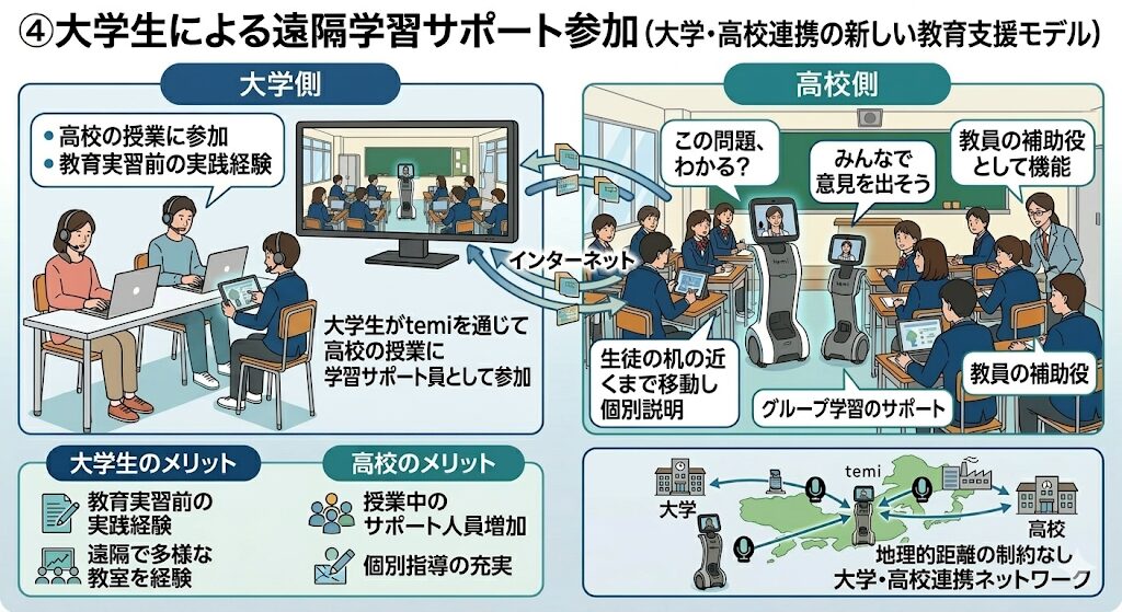 「学・高連携」の制度化: 大学生は移動なしで教育現場の実践経験を積め、高校側は質の高いサポート人員を確保できるWin-Winのモデルです。