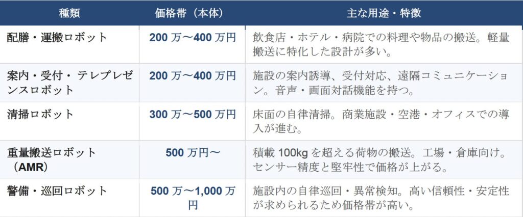 一口に「自律移動サービスロボット」といっても、用途によって設計思想も価格帯も大きく異なります。導入検討の前提として、カテゴリごとの相場感を押さえておきましょう。