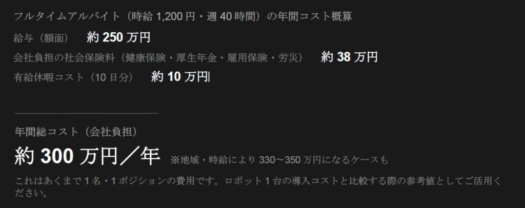 この場合、ロボットのコストは「人件費との比較」ではなく「人が来ないことで発生する機会損失・業務停止リスクとの比較」で評価すべきです。割高に見えても、「稼働させ続けられること」自体に価値があるケースが少なくありません。