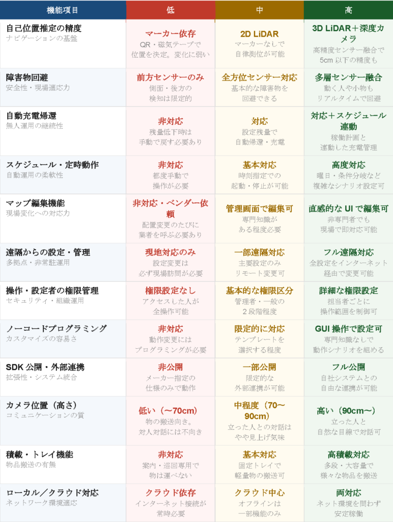 自律移動ロボットの価格は、主に以下の機能構成の違いによって決まります。導入候補の製品がそれぞれの項目でどのレベルに該当するかを確認する際の参考にしてください。