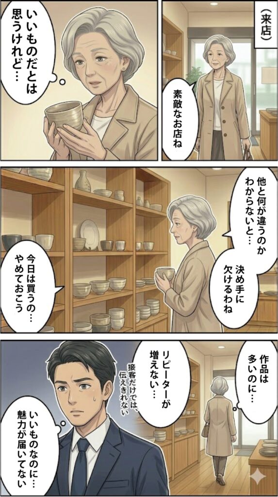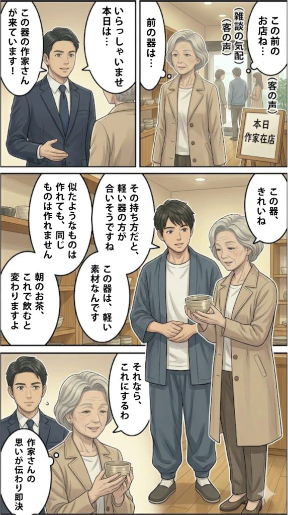 ECには絶対に再現できない体験がある。作品の前に立ち、作った人と同じ方向を向きながら、その言葉を直接聞く。その体験が、買った人をファンにする。一度来た人を、また来させる。