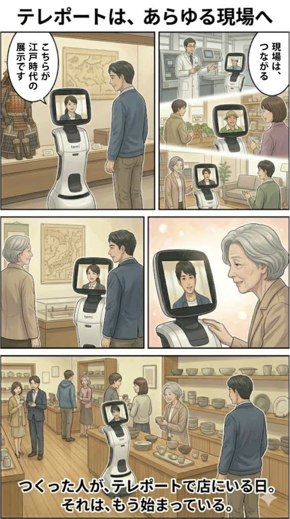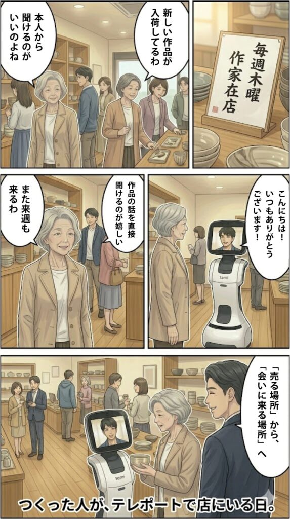 小売店やショールームには、製品を「つくった人(作り手)」がいない。その事実が、購買の先にある深い関係——ロイヤルカスタマーの形成——をいくらか阻んでいる。テレプレゼンスロボットtemi・kubiを使えば、国内外どこにいる作家や職人も、週に数時間「在店」できる。作品を一緒に眺めながら交わす対話が、ファンをつくる。特別なソフトは不要、招待URLだけで接続できる。リアルな場の価値を、もう一度深いところから取り戻す提案を書きました。